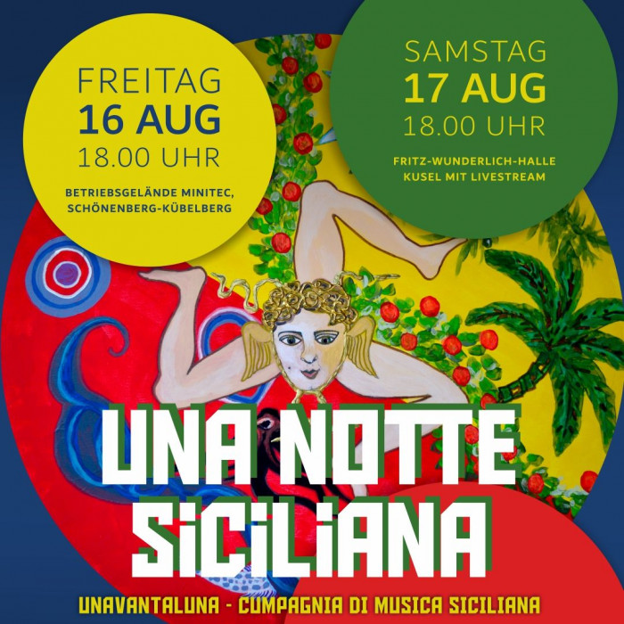 Sizilien — Kulturstern zwischen Orient und Okzident. Im Mittelpunkt stehen traditionelle Musik und Selbstkomponiertes der Gruppe Unavantaluna. Dazu kommen Lieder für Chor und Mitglieder des Barockensembles L’ Arpa Festante unter der Leitung von Roland Lißmann sowie die Kunst und Performance der deutsch-sizilianischen Künstlerin Judith Boy. Im Livestream des digitalen Zukunftsprojekt „Smart City“ - „LAND L(i)EBEN – digital.gemeinsam.vorOrt“ wird die Partnerstadt des Landkreises Kusel, Valguarnera Caropepe, eingebunden.